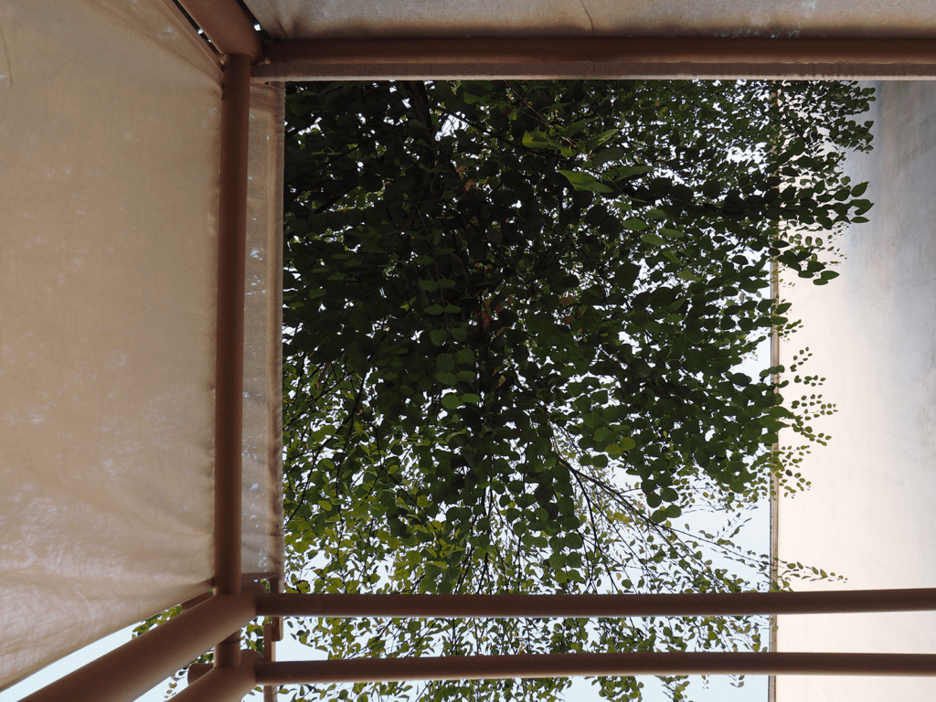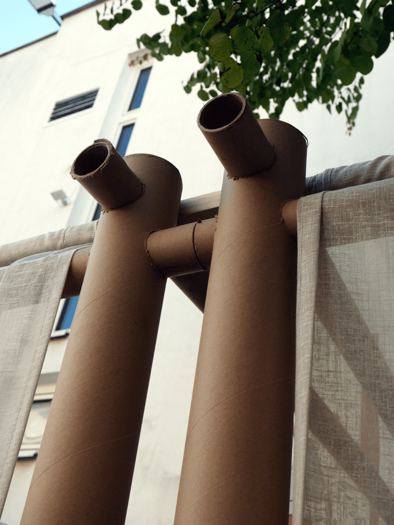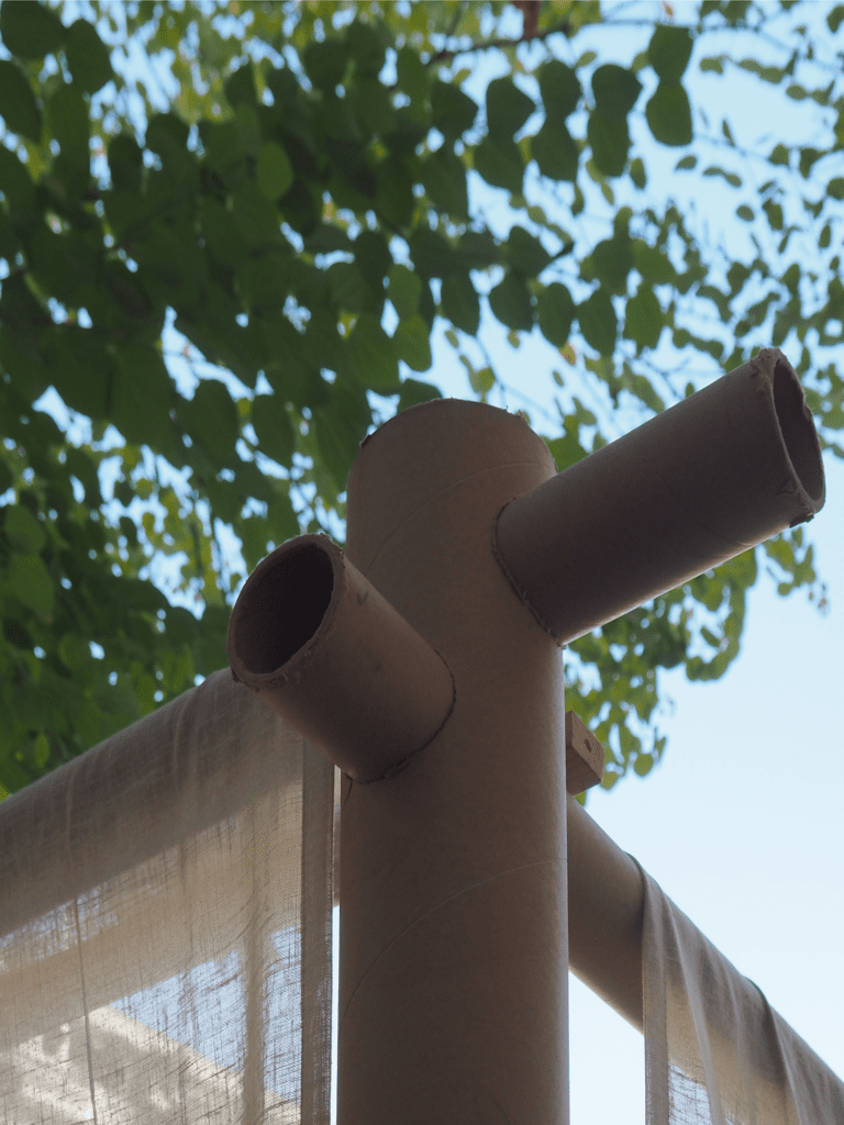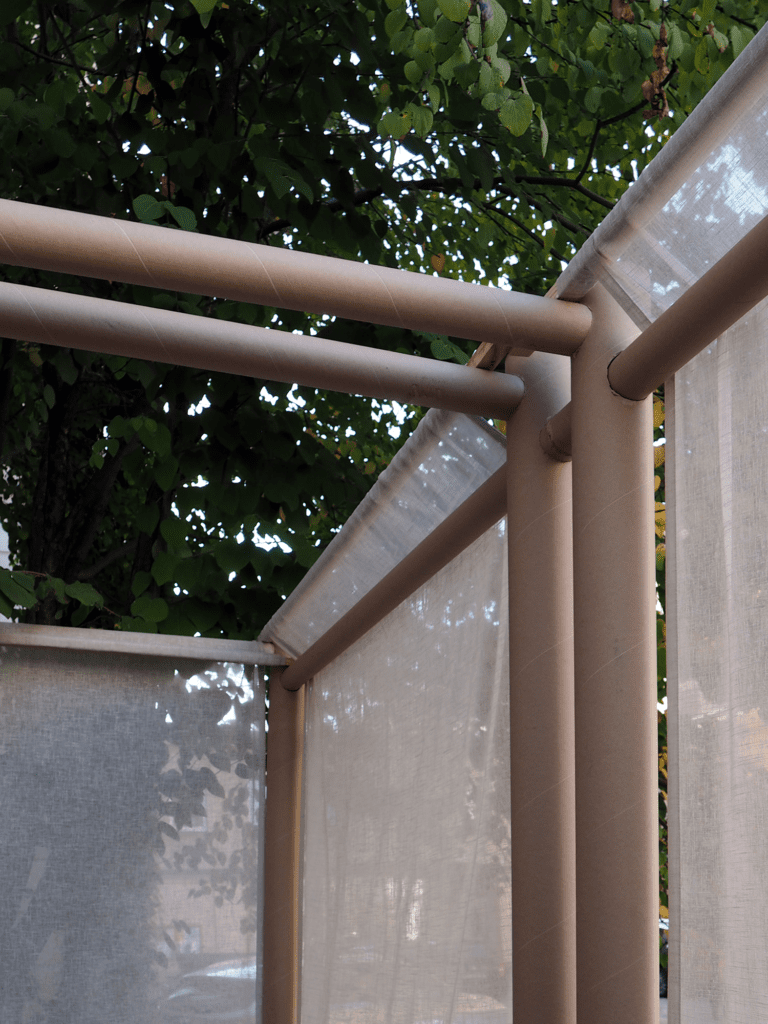 Do zbudowania tradycyjnej sukki wykorzystaliśmy współczesny system w rzeczywistości służący niesieniu pomocy potrzebującym – nieznacznie zmodyfikowany, opracowany przez Shigeru Ban Architects Paper Partition System. To metoda szybkiego i taniego organizowania przestrzeni w tymczasowych schronieniach tworzonych dla ofiar katastrof naturalnych i wojen. Na bazie konstrukcji z powszechnie dostępnych tekturowych rur powstają lekkie ściany dające uciekinierom poczucie prywatności i własnego miejsca.